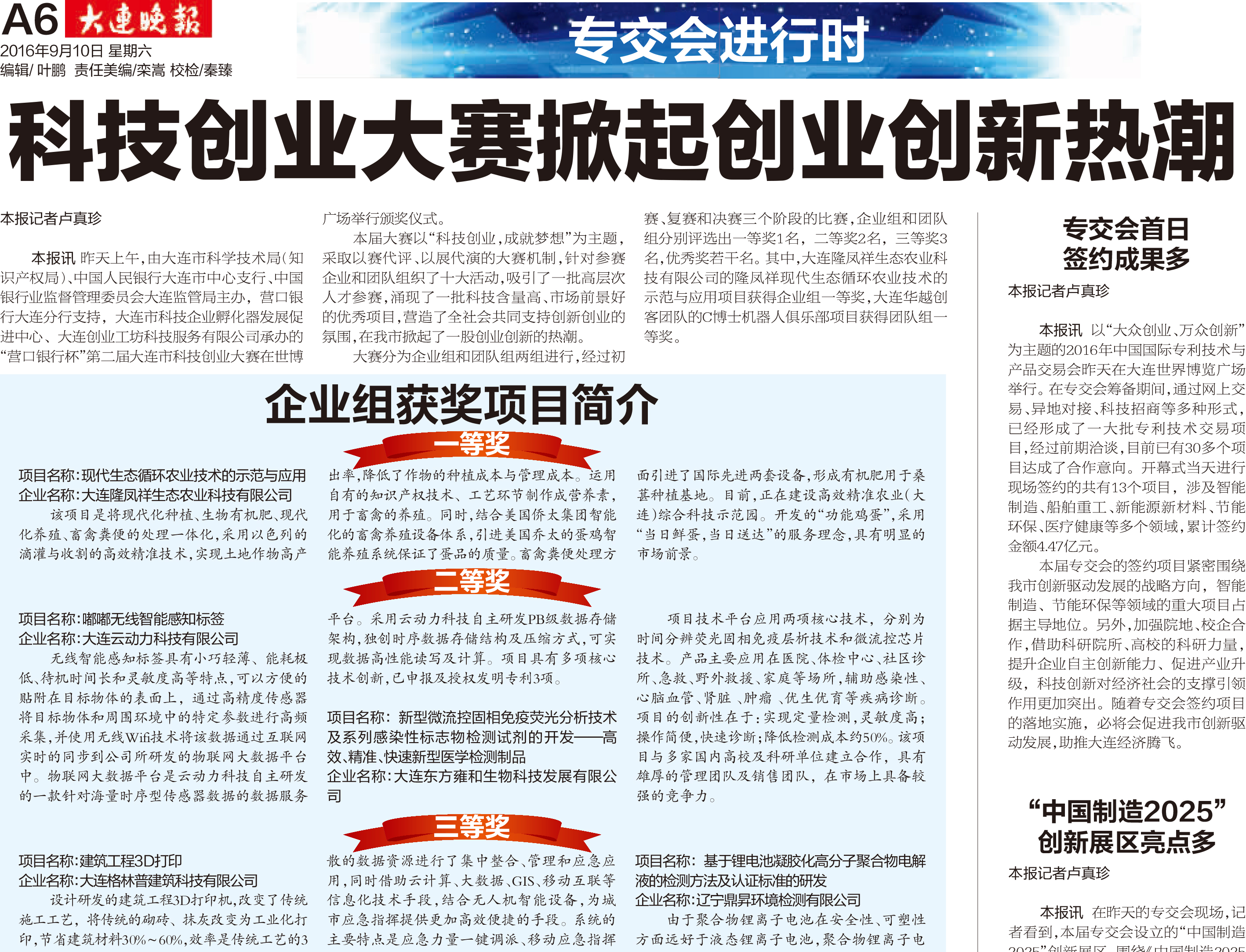創(chuàng)新引領(lǐng)發(fā)展,科技開創(chuàng)未來。2016年9月9日,由國家知識產(chǎn)權(quán)局、遼寧省政府主辦,市政府承辦的2016年(第十屆)中國國際專利技術(shù)與產(chǎn)品交易會暨大連市科技創(chuàng)業(yè)大賽頒獎典禮大連世博廣場拉開帷幕。省委常委、市委書記唐軍出席并宣布本屆專交會開幕,國家知識產(chǎn)權(quán)局局長申長雨、市長肖盛峰、世界知識產(chǎn)權(quán)組織駐中國辦事處主任陳宏兵分別致詞,市人大常委會主任里景瑞、市政協(xié)主席李萬才,市委常委、市委秘書長熊博力等出席活動,開幕式由副市長劉巖主持,并為第二屆大連市科技創(chuàng)業(yè)大賽獲獎?wù)哳C獎。